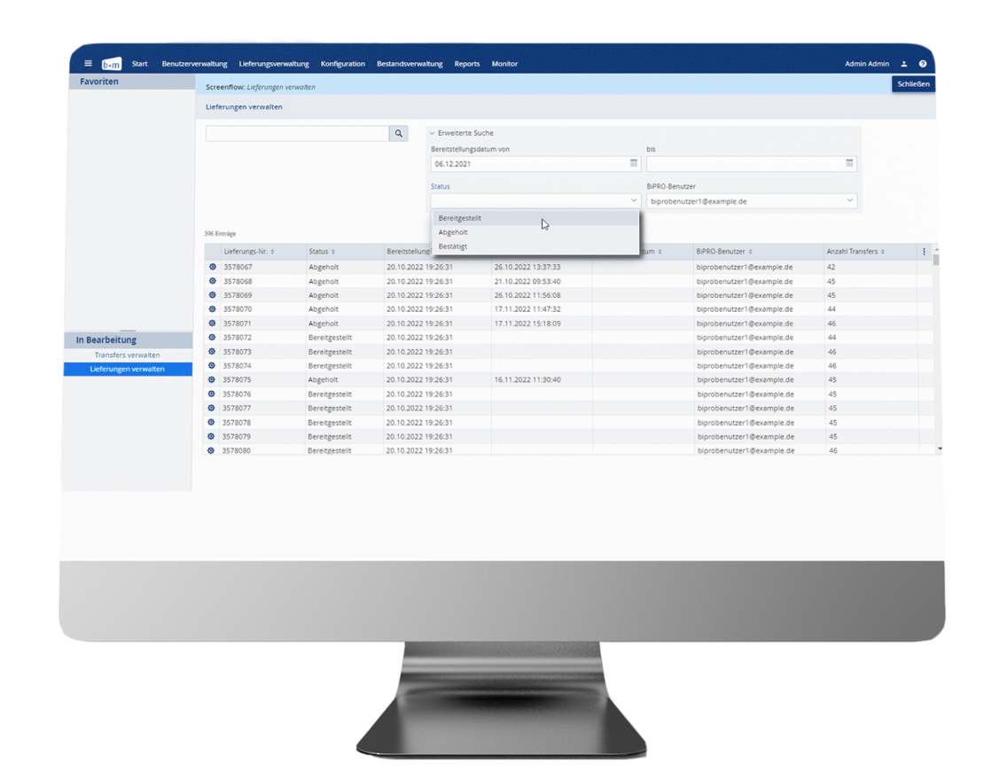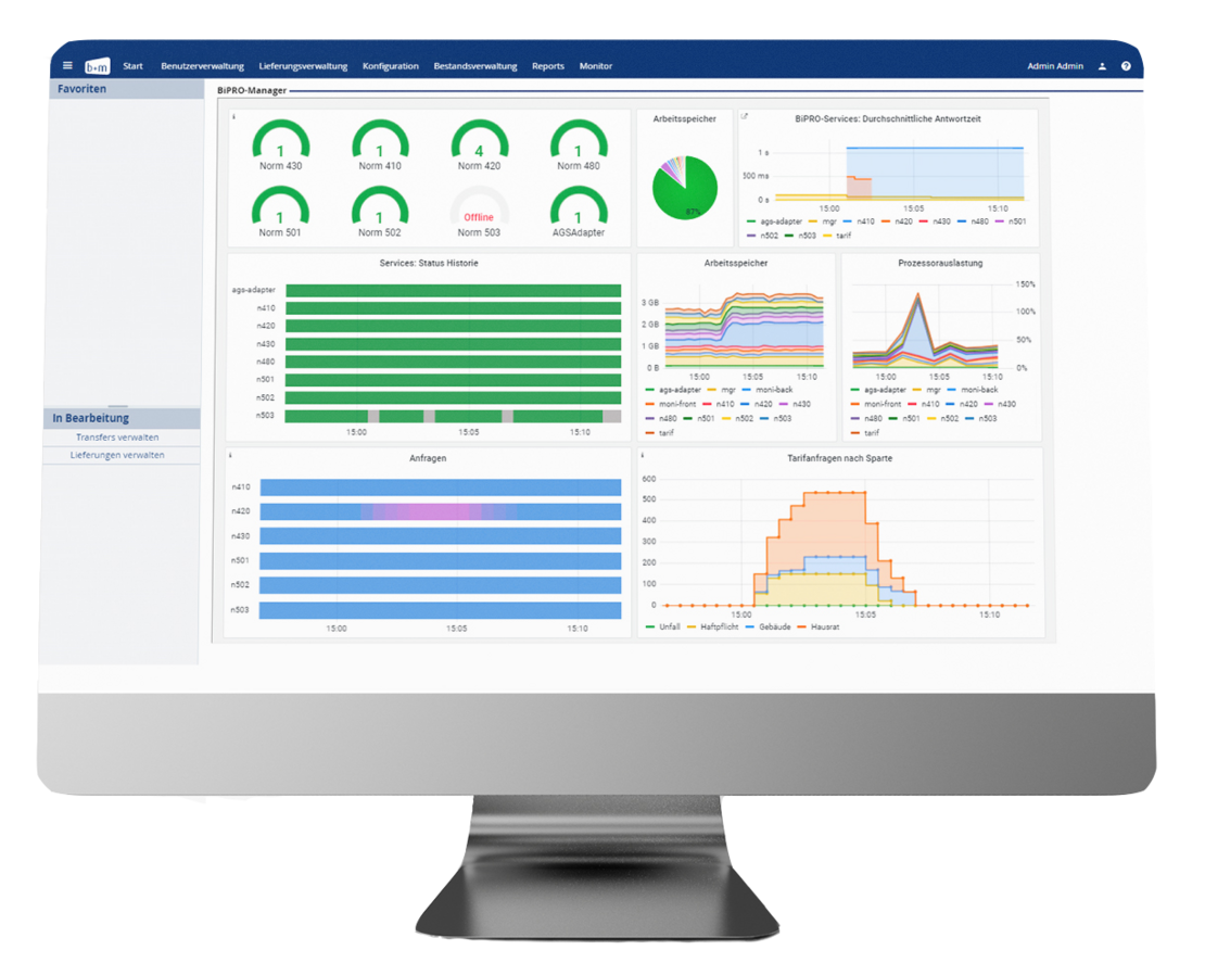 Die Zusatzkomponenten b+m BiPRO Monitor und b+m BiPRO Client überwachen die Verfügbarkeit Ihrer Systeme und unterstützen Sie bei fachlichen und technischen Tests Ihrer BiPRO-Services. So haben Sie jederzeit alles im Blick und sind in der Lage – dank anschaulich visualisierter Ergebnisse – zeitnah auf mögliche Probleme zu reagieren.
